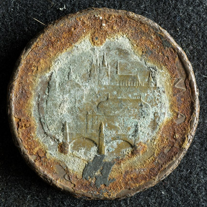 Mince zkorodovaná tak, že reliéf je nečitelný, spadá do skupiny nestandardně poškozených mincí.