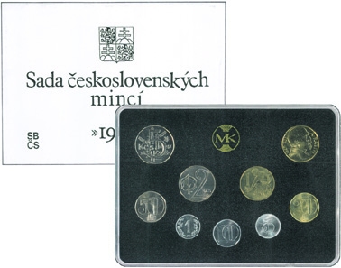 kartonový přebal s černým potiskem 145x105 mm, v přebalu čirá polystyrénová etue s černou polystyrénovou deskou s vyzlaceným státním znakem ČSFR na líci a logem mincovny na rubu, v desce vsazené mince 1,5,10,20,50 h, 1,2,5 Kčs a žeton mincovny resp. 10 Kčs