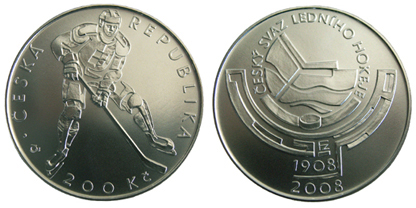 Dnem 20. srpna 2008 vydává Česká národní banka do oběhu pamětní stříbrnou dvousetkorunu ke 100. výročí založení Českého svazu ledního hokeje. Dvousetkoruna je ražena ze slitiny obsahující 900 dílů stříbra a 100 dílů mědi a vydává se ve dvojím provedení, v běžném a špičkovém (proof), které se liší povrchovou úpravou a provedením hrany. U mincí špičkové kvality je pole mince vysoce leštěné a reliéf je matován, hrana je hladká s vlysem „ČESKÁ NÁRODNÍ BANKA * Ag 0.900 * 13 g *“. Mince běžné kvality mají hranu vroubkovanou. Průměr mince je 31 mm, hmotnost 13 g a síla je 2,5 mm. Stejně jako u každé ražby mincí jsou i u těchto mincí povoleny odchylky v průměru 0,1 mm a v síle 0,15 mm. V hmotnosti je povolena odchylka nahoru 0,26 g a v obsahu stříbra odchylka nahoru 1%.