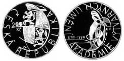 Při příležitosti 200. výročí založení Akademie výtvarných umění v Praze, která je nejstarší vysokou uměleckou školou na našem území, vydá Česká národní banka dne 1. září 1999 do oběhu stříbrnou pamětní 200 Kč minci. Při zachování stejného obrazu se mince vydává ve dvojím provedení ražby. V klasickém běžném provedení a ve zvláštním špičkovém provedení tzv. proof pro náročné sběratele numismatiky. Obě mince se od sebe liší hlavně v povrchové úpravě. U běžné kvality je mincovní pole i reliéf leštěn stejně, u mincí proof je mincovní pole vyleštěno do vysokého lesku a reliéf je matován. Dále se u obou kvalit liší hrana mince. U běžné kvality je vroubkovaná, u kvality proof je hladká s vlysem " ČESKÁ NÁRODNÍ BANKA * Ag 0,900 * 13 g * ".