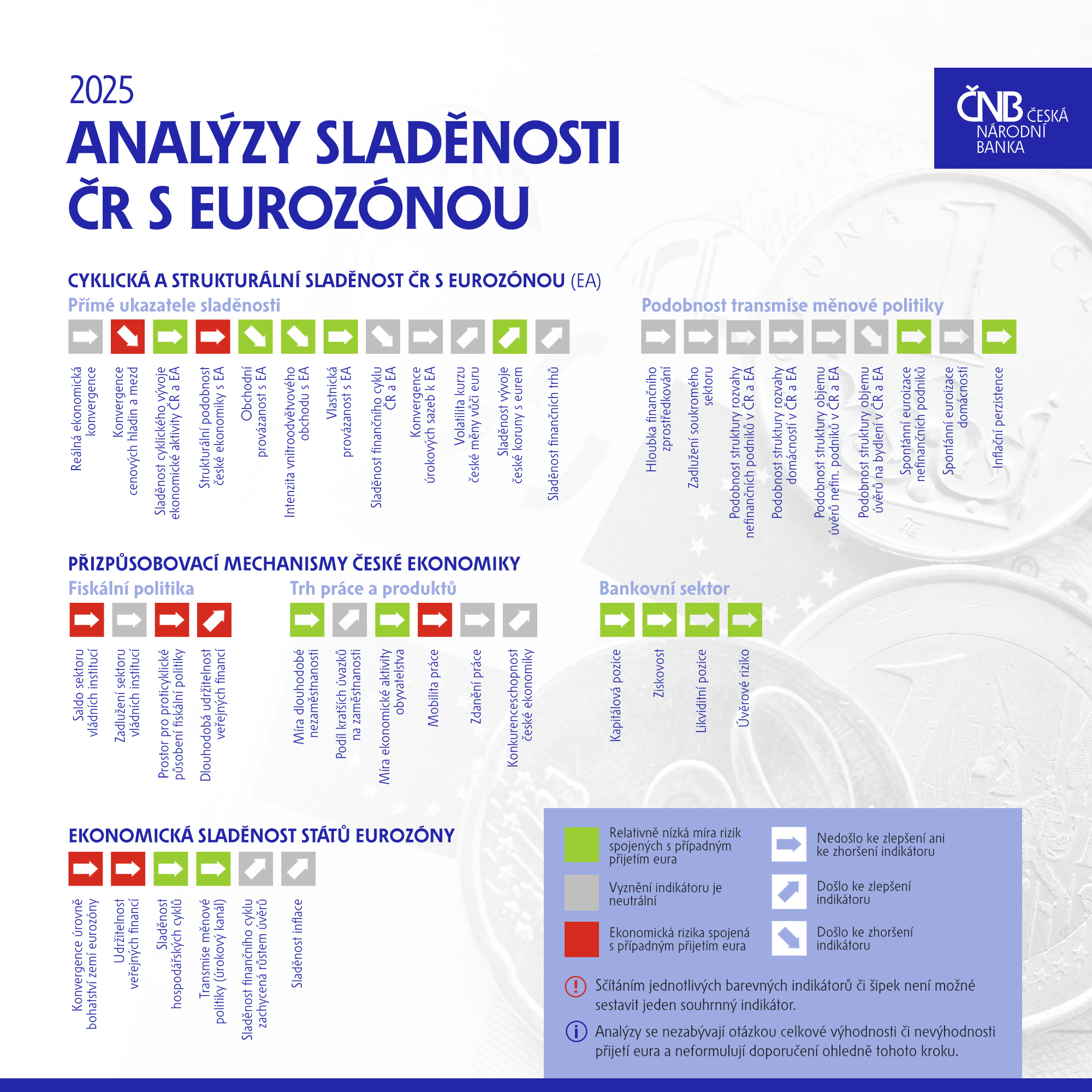 Česká národní banka zveřejnila publikaci Analýzy stupně ekonomické sladěnosti České republiky s eurozónou (pdf, 1,8 MB), která poskytuje ucelený pohled na českou ekonomiku optikou dlouhodobého závazku ČR přijmout společnou evropskou měnu. Každý rok nezávisle hodnotí míru sladěnosti domácí ekonomiky s eurozónou a vedle toho upozorňuje na možná ekonomická rizika vstupu do měnové unie. Věnuje se také dění v eurozóně, zejména pak vzájemné ekonomické sladěnosti jejích členských zemí a rovněž vybraným institucionálním otázkám. Tato publikace je odborným analytickým materiálem z dílny expertů ČNB, který posuzuje tradičně vymezený okruh makroekonomických témat. Jeho součástí není doporučení ohledně přijetí eura ani hodnocení celkové výhodnosti či nevýhodnosti tohoto kroku. Rozhodnutí o stanovení cílového data pro vstup do eurozóny přísluší vládě ČR.