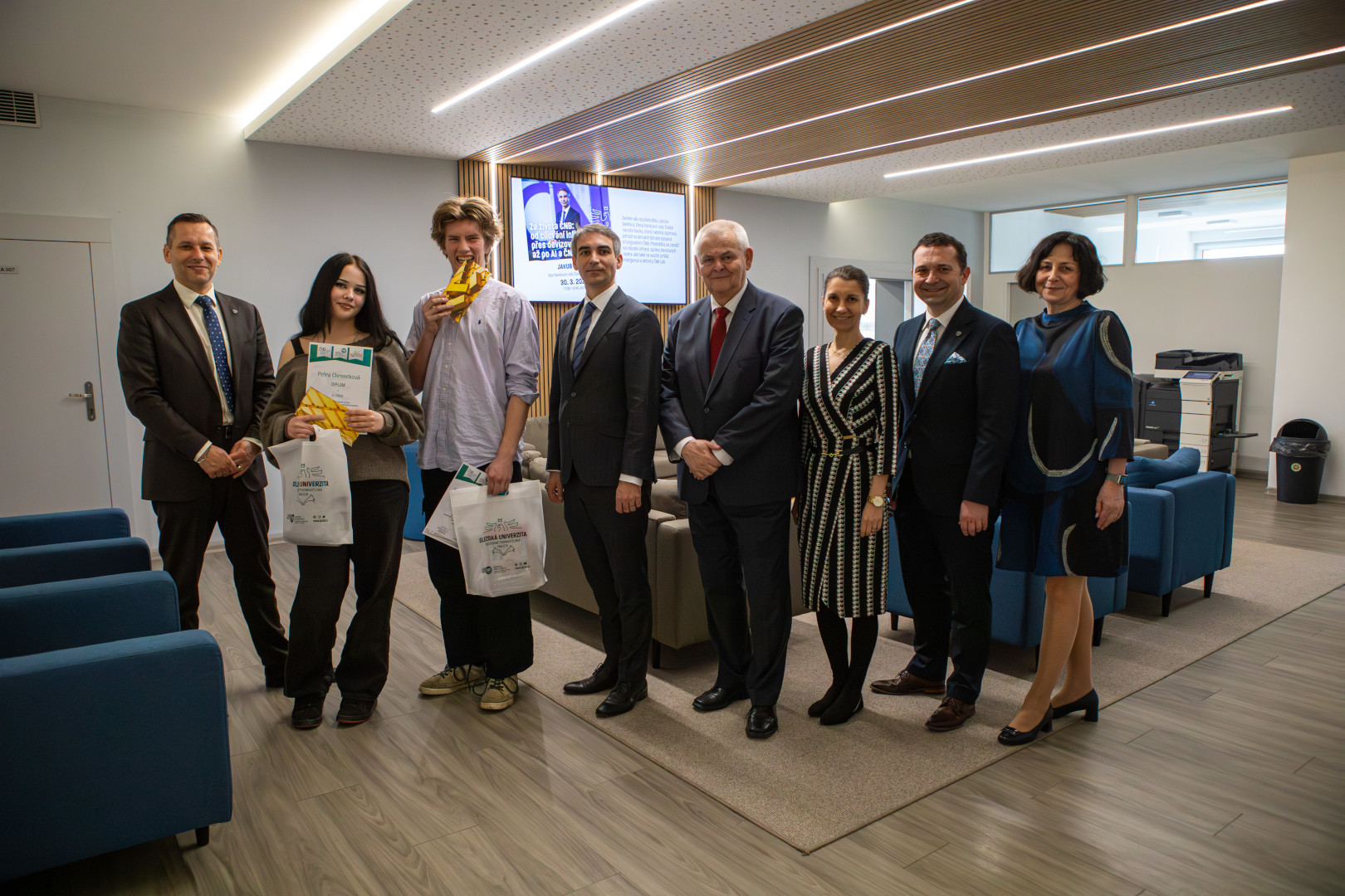 Ocenění vítězům předali člen bankovní rady ČNB Jakub Seidler, děkan Obchodně podnikatelské fakulty Roman Šperka a vedoucí katedry financí a účetnictví OPF Daniel Stavárek. Člen bankovní rady Jakub Seidler na univerzitě rovněž diskutoval se studenty o centrální bance v rámci přednášky: Ze života ČNB: od cílování inflace přes devizové rezervy až po AI a ČNB Lab.