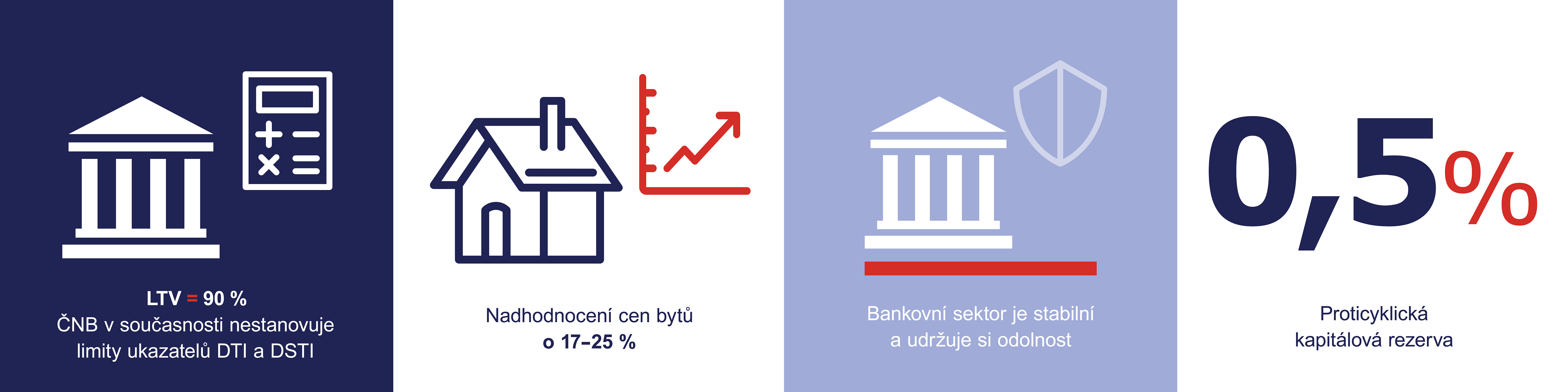- Rizikem pro finanční stabilitu českého bankovního sektoru jsou rostoucí ceny nemovitostí a tendence některých bank poskytovat vyšší objem značně rizikových hypotečních úvěrů (s DSTI nad 40 % a DTI nad 8násobkem čistých příjmů).