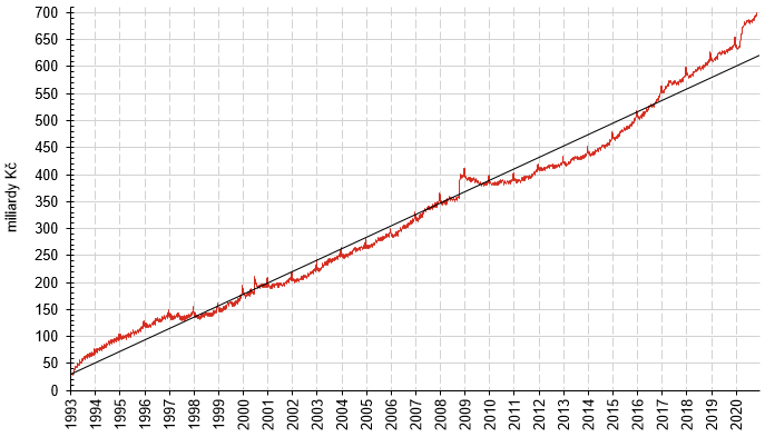 - 700 miliard Kč v listopadu 2020 (nárůst o 100 mld. Kč za 28 měsíců)