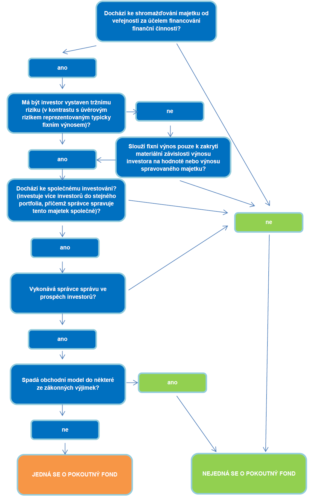 - Ve většině případů lze pro posouzení naplnění znaků pokoutného fondu využít grafické znázornění rozhodovacího schématu přiložené v příloze tohoto stanoviska. Toto schéma se netýká investičních fondů, jejichž obhospodařovatel disponuje odpovídajícím oprávněním.