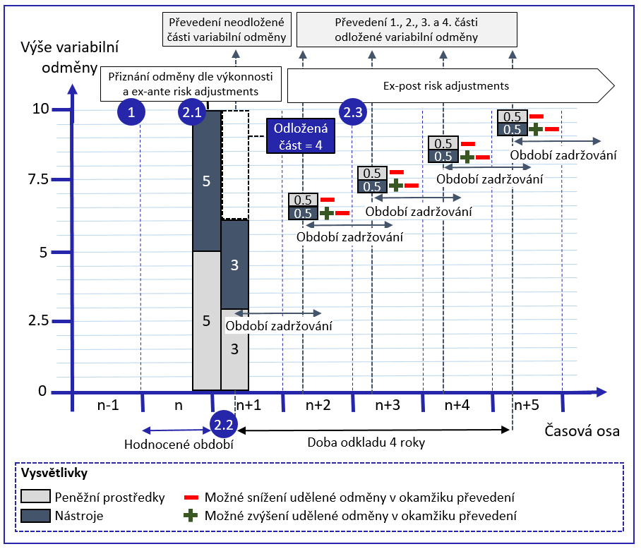 - Graf znázorňuje aplikaci výše popsaného čl. 94 odst. 1 písm. m) a l) směrnice CRD při dodržení minimálních požadavků, tj. odkládá se 40 % přiznané variabilní odměny a v nástrojích je uděleno 50 % variabilní odměny jak pro odloženou, tak pro neodloženou část. Přiznávaná výše variabilní odměny je stanovena na 10 jednotek a dotaz tazatele se tak týká 2 jednotek peněžních prostředků převáděných v letech n+2, n+3, n+4 a n+5. Na časové ose se tak nacházíme před převedením 1., 2., 3. nebo 4. části variabilní odměny, přičemž převáděná 0,5 jednotka by byla navýšena o růst spotřebitelských cen od okamžiku přiznání variabilní odměny (na začátku n+1) až do okamžiku příslušeného převedení, tj. za dobu trvání doby odkladu příslušné 0,5 jednotky.