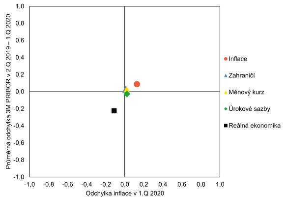 Sekce měnová hodnotí bilanci rizik prognózy ze Zprávy o inflaci I/2019 jako zhruba vyrovnanou. V simulaci GRIPu působí jednotlivá rizika plynoucí z nově publikovaných údajů v součtu přibližně neutrálně. Ve směru vyšší inflace i úrokových sazeb je rizikem především rychlejší pozorovaný domácí růst spotřebitelských cen. Tento vliv je však vyvažován protiinflačním vyzněním nově dostupných dat z domácí ekonomiky, a to především pomalejším mzdovým růstem v tržní sféře a nižší dynamikou spotřeby domácností. Odchylky vývoje měnového kurzu a úrokových sazeb v dosavadním průběhu prvního čtvrtletí od prognózy jsou zanedbatelné. V případě zahraničních veličin se vzájemně kompenzuje vyšší výhled cen výrobců v efektivní eurozóně s nižší očekávanou trajektorií eurových úrokových sazeb při sníženém výhledu růstu zahraniční poptávky.
