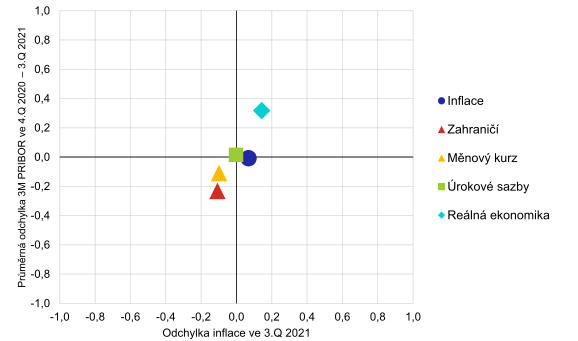 V kontextu letošního bezprecedentního hospodářského vývoje lze rizika prognózy ze Zprávy o inflaci III/2020, která plynou z nově dostupných makroekonomických údajů a která jsou zachycena v simulaci GRIPu, hodnotit jako individuálně relativně umírněná a v souhrnu vyrovnaná. Ve směru mírně vyšších domácích úrokových sazeb i inflace v simulaci působí vývoj domácí reálné ekonomiky zohledňující zejména o něco rychlejší než očekávaný růst průměrné mzdy ve druhém čtvrtletí. V opačném směru působí oproti prognóze v průměru zatím mírně silnější kurz koruny vůči euru a především vývoj v zahraničí, který odráží hlavně nižší výhled zahraničních cen výrobců v příštím roce. Prognóza domácích úrokových sazeb i inflace se naplňuje, a v simulaci tak tyto body působí zhruba neutrálně. Celkově lze shrnout, že základní scénář stávající prognózy se zatím poměrně dobře naplňuje.