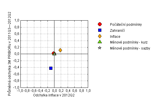 Výsledky modelových simulací zachycených v GRIPu (viz níže) znamenají vyrovnanou bilanci rizik prognózy celkové inflace ze Zprávy o inflaci (ZoI) II/2011 při mírném riziku ve směru nižších úrokových sazeb. Nejvýraznější vliv na bilanci rizik má vývoj v zahraničí, odrážející zejména nižší tržní výhled zahraničních úrokových sazeb od konce roku 2011. Naproti tomu slabě proinflačně působí vyšší domácí inflace v květnu 2011. Ostatní body v grafu jsou pak blízko průsečíku os. Vývoj domácích úrokových sazeb a měnového kurzu v průběhu druhého čtvrtletí letošního roku odpovídá prognóze, a působí tudíž neutrálně. Působení počátečních podmínek je v souhrnu rovněž zhruba neutrální, a to i přes rychlejší růst mezd a HDP v prvním čtvrtletí roku 2011 oproti prognóze ze ZoI II/2011. Aktuální odchylky od prognózy směrem nahoru jsou totiž v GRIPu kompenzovány více protiinflační strukturou růstu ekonomiky, a to nejen v prvním čtvrtletí 2011, ale i na minulosti z důvodu revize historických dat.
