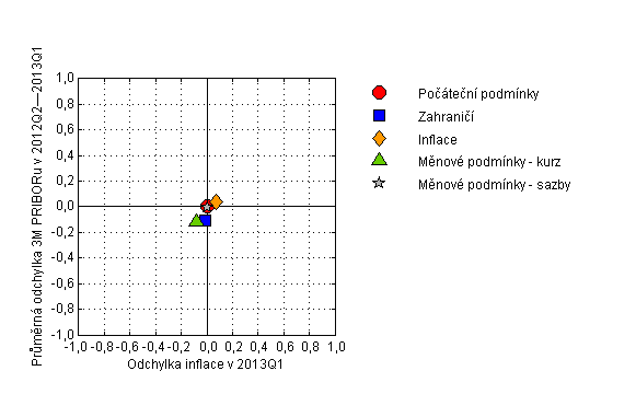 Výsledky modelových simulací zachycených v GRIPu znamenají zhruba neutrální bilanci rizik prognózy inflace ze Zprávy o inflaci I/2012 při lehce nižším výhledu úrokových sazeb. Mírně směrem dolů působí vývoj kurzu a zahraničí. To je částečně kompenzováno vyšší domácí inflací. Vývoj domácí reálné ekonomiky včetně trhu práce (bod Počáteční podmínky) a úrokových sazeb odpovídá prognóze.