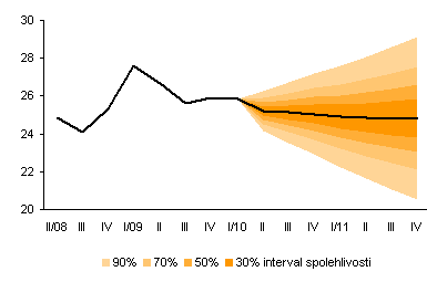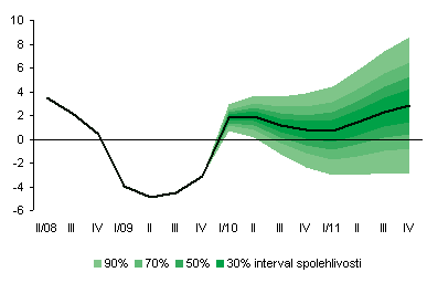Vějířový graf zachycuje nejistotu budoucího vývoje sezonně očištěného růstu HDP. Nejtmavší pásmo kolem středu prognózy odpovídá vývoji, který nastane s 30% pravděpodobností. Rozšiřující se pásma zobrazují postupně vývoj s pravděpodobností 50 %, 70 % a 90 %.
