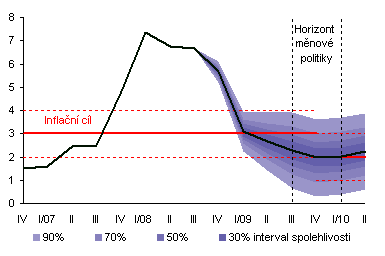 Vějířový graf zachycuje nejistotu budoucího vývoje inflace spotřebitelských cen. Nejtmavší pásmo kolem středu prognózy odpovídá vývoji, který nastane s 30% pravděpodobností. Rozšiřující se pásma zobrazují postupně vývoj s pravděpodobností 50 %, 70 % a 90 %.