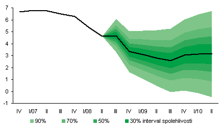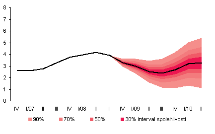 Vějířový graf zachycuje nejistotu budoucího vývoje sezonně očištěného růstu HDP. Nejtmavší pásmo kolem středu prognózy odpovídá vývoji, který nastane s 30% pravděpodobností. Rozšiřující se pásma zobrazují postupně vývoj s pravděpodobností 50 %, 70 % a 90 %.
