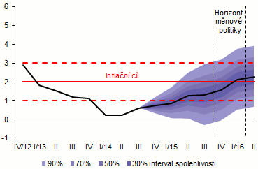 Vějířový graf zachycuje nejistotu budoucího vývoje inflace spotřebitelských cen. Nejtmavší pásmo kolem středu prognózy odpovídá vývoji, který nastane s 30% pravděpodobností. Rozšiřující se pásma zobrazují postupně vývoj s pravděpodobností 50 %, 70 % a 90 %.