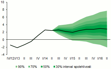 Vějířový graf zachycuje nejistotu budoucího vývoje sezonně očištěného růstu HDP. Nejtmavší pásmo kolem středu prognózy odpovídá vývoji, který nastane s 30% pravděpodobností. Rozšiřující se pásma zobrazují postupně vývoj s pravděpodobností 50 %, 70 % a 90 %.