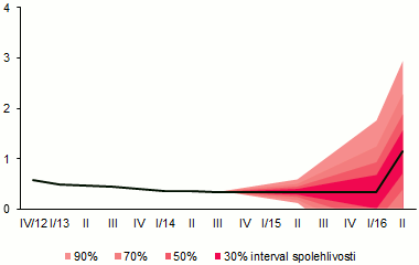 Vějířový graf zachycuje nejistotu budoucího vývoje měnověpolitické inflace. Nejtmavší pásmo kolem středu prognózy odpovídá vývoji, který nastane s 30% pravděpodobností. Rozšiřující se pásma zobrazují postupně vývoj s pravděpodobností 50 %, 70 % a 90 %.