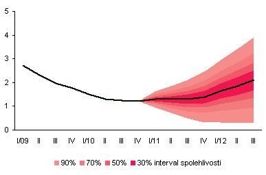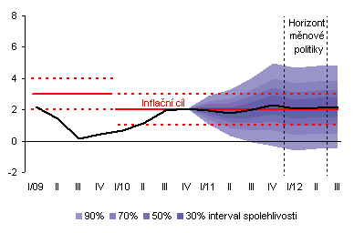 Vějířový graf zachycuje nejistotu budoucího vývoje inflace spotřebitelských cen. Nejtmavší pásmo kolem středu prognózy odpovídá vývoji, který nastane s 30% pravděpodobností. Rozšiřující se pásma zobrazují postupně vývoj s pravděpodobností 50 %, 70 % a 90 %.