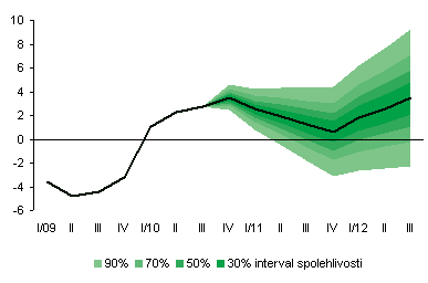 Vějířový graf zachycuje nejistotu budoucího vývoje sezonně očištěného růstu HDP. Nejtmavší pásmo kolem středu prognózy odpovídá vývoji, který nastane s 30% pravděpodobností. Rozšiřující se pásma zobrazují postupně vývoj s pravděpodobností 50 %, 70 % a 90 %.