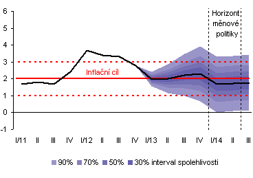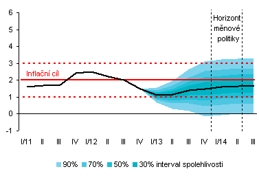 Vějířový graf zachycuje nejistotu budoucího vývoje inflace spotřebitelských cen. Nejtmavší pásmo kolem středu prognózy odpovídá vývoji, který nastane s 30% pravděpodobností. Rozšiřující se pásma zobrazují postupně vývoj s pravděpodobností 50 %, 70 % a 90 %.