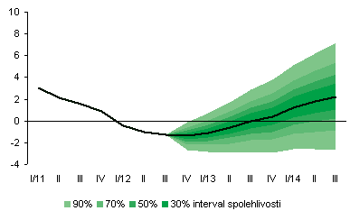 Vějířový graf zachycuje nejistotu budoucího vývoje sezonně očištěného růstu HDP. Nejtmavší pásmo kolem středu prognózy odpovídá vývoji, který nastane s 30% pravděpodobností. Rozšiřující se pásma zobrazují postupně vývoj s pravděpodobností 50 %, 70 % a 90 %.