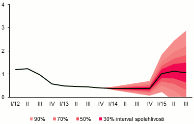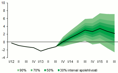 Vějířový graf zachycuje nejistotu budoucího vývoje sezonně očištěného růstu HDP. Nejtmavší pásmo kolem středu prognózy odpovídá vývoji, který nastane s 30% pravděpodobností. Rozšiřující se pásma zobrazují postupně vývoj s pravděpodobností 50 %, 70 % a 90 %.