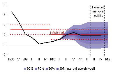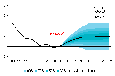 Vějířový graf zachycuje nejistotu budoucího vývoje inflace spotřebitelských cen. Nejtmavší pásmo kolem středu prognózy odpovídá vývoji, který nastane s 30% pravděpodobností. Rozšiřující se pásma zobrazují postupně vývoj s pravděpodobností 50 %, 70 % a 90 %.