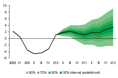 Vějířový graf zachycuje nejistotu budoucího vývoje sezonně očištěného růstu HDP. Nejtmavší pásmo kolem středu prognózy odpovídá vývoji, který nastane s 30% pravděpodobností. Rozšiřující se pásma zobrazují postupně vývoj s pravděpodobností 50 %, 70 % a 90 %.