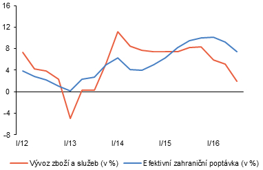 Rozdíl v dynamikách vývozu a zahraniční poptávky se ve třetím čtvrtletí 2016 znatelně prohloubil