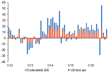 Z pohledu geografického členění se jednalo zejména o odeznění růstu a následný pokles vývozu v automobilovém průmyslu do zemí západní Evropy. To potvrzují také individuální data o průmyslové produkci v tomto odvětví, z nichž je patrné znatelné zářijové zpomalení meziročního růstu tržeb z vývozu vlastních výrobků do zemí eurozóny (Graf 3). Dominantní vliv přitom mělo zpomalení meziroční dynamiky tržeb vývozců komponent pro automobilový průmysl. Nižší růst tržeb z vývozu však v září v souhrnu vykázali také hlavní tuzemští výrobci aut. Mezi nimi přitom byly výrazné rozdíly z hlediska vývoje tržeb i dynamiky vyrobeného a exportovaného počtu automobilů. V průběhu čtvrtého čtvrtletí 2016 se sice souhrnný růst tržeb výrobců aut navrátil k úrovním z první poloviny roku 2016, nadále slabý nicméně zůstal růst tržeb z vývozu komponent pro automobilový průmysl.