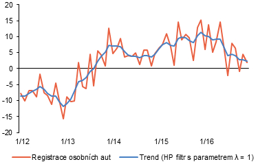 Data zahraničního obchodu i průmyslové produkce tedy naznačují, že výrazné zpomalení vývozu ve třetím čtvrtletí 2016 bylo způsobeno vývojem v automobilovém sektoru. Domácí výroba aut pak sice po krátkodobém výpadku ve třetím čtvrtletí následně rychle oživila, vývoz komponent pro automobilový průmysl však zůstal utlumený i v prvních dvou měsících čtvrtého čtvrtletí. To pravděpodobně souvisí s vývojem poptávky po nových automobilech v západní Evropě, kterou je možné aproximovat statistikou registrací nových osobních aut. Data Evropské asociace výrobců automobilů ukazují, že meziroční dynamika registrací nových osobních aut dosáhla nejvyšších hodnot v první polovině loňského roku. Ve druhém pololetí 2016 však byl pozorovaný růst registrací ve srovnání s prvním pololetím méně než poloviční a trendově se dále snižoval (Graf 4).2 Výkon automobilového průmyslu směřujícího v převážné míře na vývoz tudíž nebyl – na rozdíl od prvního pololetí – schopen tak výrazně převážit nad přetrvávajícím poklesem vývozu chemických výrobků, paliv a elektrické energie, který byl v loňském roce zapříčiněn výpadky domácí produkce.