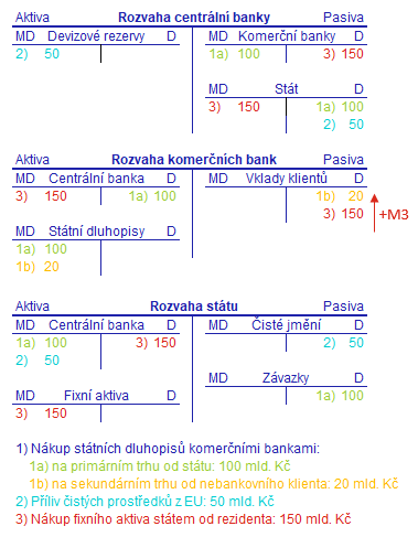 Účetní schéma ilustruje mechanismus zvyšování peněžní zásoby, pokud je deficit sektoru vládních institucí financován komerčními bankami, případně pokud dochází k čistému přílivu prostředků z EU. Nákup státních dluhopisů na primárním trhu (případ 1a, pro ilustraci např. 100 mld. Kč) banky financují z aktivního účtu likvidity uložené u centrální banky. Státu, kterému centrální banka vede účet v rámci svých pasiv, přibude likvidita (nejedná se o peněžní agregát), proti které vznikne nový závazek. Doposud se jedná o operaci v rámci finančního systému. Také příliv čistých prostředků z EU zvyšuje objem likvidity státu vedené v pasivech rozvahy centrální banky (případ 2, např. 50 mld. Kč). Zde dochází současně k růstu objemu devizových rezerv centrální banky. Konverzi likvidity z eur do korun pak provádí centrální banka mimo devizový trh bez vlivu na měnový kurz. V obou případech až realizací výdajů státu od rezidenta (případ 3, v souhrnu např. 150 mld. Kč) dojde k převodu likvidity zpět do komerčních bank na aktivní straně jejich bilance a k růstu vkladů nebankovních klientů na straně pasiv. Až tímto okamžikem došlo k růstu množství peněz v ekonomice definovaných peněžním agregátem M3. Měnový dopad má také nákup státních dluhopisů bankami od nebankovních subjektů na sekundárním trhu[1]. Celkový závazek státu se tím nikterak nemění, avšak změna držby dluhopisů směrem k bankám navyšuje vklady těchto nebankovních subjektů, které původně dluhopisy vlastnily (případ 1b, např. 20 mld. Kč), a ty již jsou součástí peněžní zásoby M3.