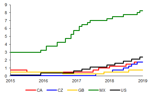 1 Zvyšování úrokových sazeb ve Spojeném Království odráželo jak reakci na negativně ovlivněný potenciál hospodářského růstu po referendu o brexitu (ekonomika tak vykazovala známky přehřívání navzdory tomu, že růst HDP dosahoval výrazně nižších temp než dříve), tak i stabilizační reakci Bank of England na inflační tlaky vyvolané depreciací libry. Zvyšování úrokových sazeb v Mexiku bylo ještě více motivováno stabilizací inflace vlivem oslabujícího mexického pesa a rovněž nárůstem uskutečněných i diskutovaných protekcionistických opatření prezidenta D. Trumpa mezi Mexikem a Spojenými státy.