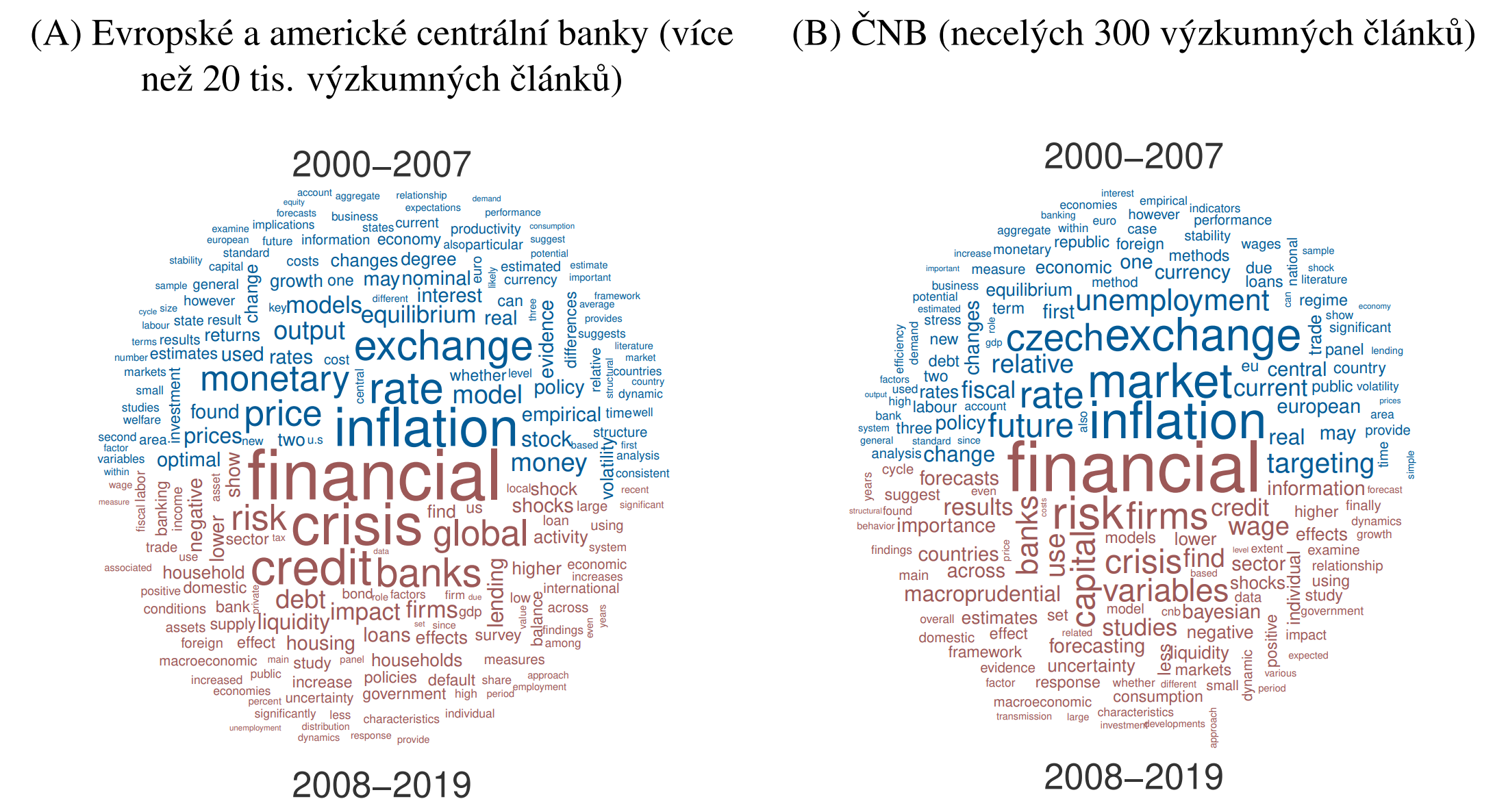 Výzkumu ČNB v loňském roce dominovala témata z oblasti finanční stability. Podobně je tomu i u řady dalších centrálních bank, které se po globální finanční krizi přeorientovaly z témat blízkých měnové politice právě na témata související s finančním sektorem, systémovými riziky a obezřetnostní regulací (viz graf níže). Další charakteristiky a nové trendy výzkumu centrálních bank popisujeme v článku RPN 3/2020: Researching the Research: A Central Banking Edition (S. Malovaná a kol.), ve kterém analyzujeme více než 20 tisíc výzkumných publikací evropských a amerických centrálních bank.
