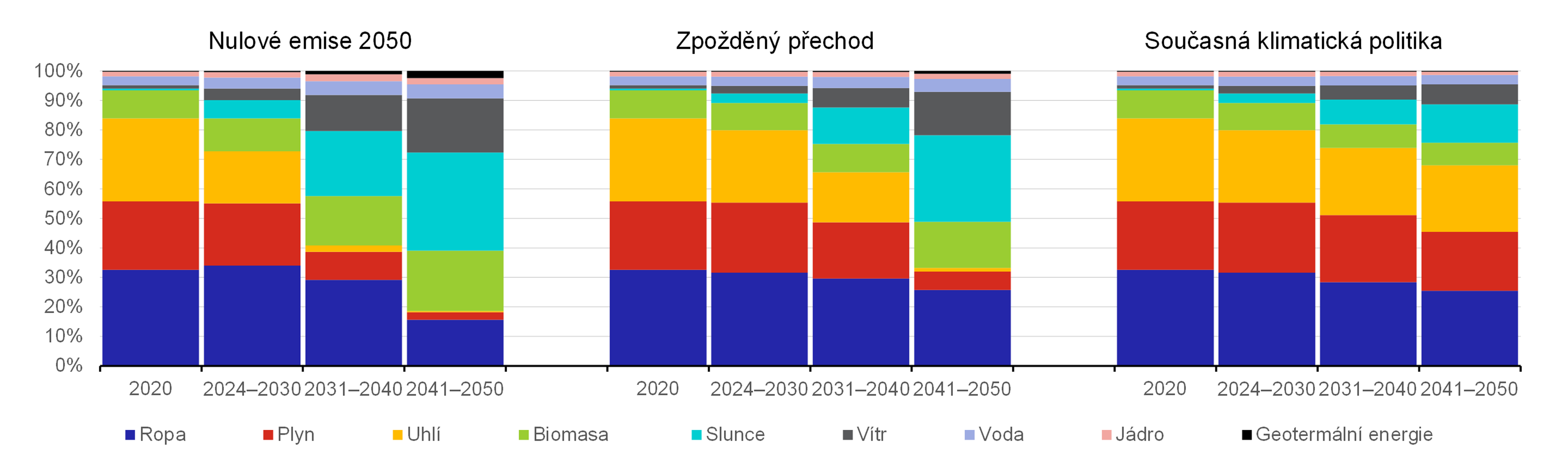 Graf 5 – Předpoklady o světové spotřebě energie dle zdroje produkce pro jednotlivé klimatické scénáře
