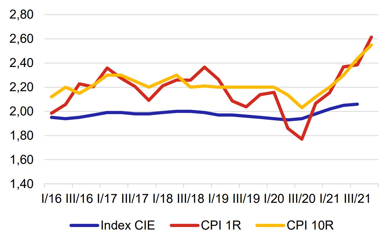 Poznámka: Index CIE: Index of Common Inflation Expectations – souhrnný ukazatel inflačních očekávání, očekávaná inflace za 10 let, měřeno indexem PCE, zdroj Fed. CPI 1R a 10R: Inflace očekávaná analytiky za 1 rok, respektive za 10 let, měřeno indexem CPI, zdroj Survey of Professional Forecasters.