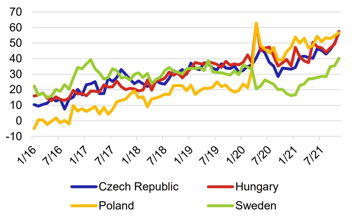 Inflační očekávání domácností ve vybraných zemích EU mimo eurozónu ukazuje Graf 2.[8] Očekávání byla v těchto zemích nárazově vychýlena vypuknutím koronavirové pandemie na jaře 2020, ovšem rozdílně napříč zeměmi – v České republice, Maďarsku a Polsku došlo k jejich zvýšení, ve Švédsku naopak ke snížení, což odráželo tehdejší výraznou nejistotu o dalším ekonomickém vývoji. Po tomto úvodním šoku došlo ve všech zemích k jeho alespoň částečné kompenzaci. Během roku 2021 pak inflační očekávání v těchto zemích rostla a zvláště v ČR, Maďarsku a Polsku se nacházejí na znatelně zvýšených úrovních, ve Švédsku však zatím výrazně nepřevyšují předpandemické hodnoty. Centrální banky tří zmíněných středoevropských zemí během druhé poloviny roku 2021 rychlým tempem zpřísňovaly svoji měnovou politiku (kdy ČNB a maďarská MNB tento krok dopředu avizovaly s ohledem na přítomnost silných a perzistentních domácích inflačních tlaků, zatímco polská NBP nejprve považovala inflační tlaky za nabídkové a dočasné, což následně částečně přehodnotila a reagovala také rychlým navyšováním úrokových sazeb). Oproti tomu švédská Riksbank zatím nevidí výrazné domácí inflační tlaky ani hrozbu ztráty ukotvenosti inflačních očekávání, současnou inflaci považuje za dočasnou, své úrokové sazby tak zatím nezměnila a ani to v dohledné budoucnosti neplánuje.