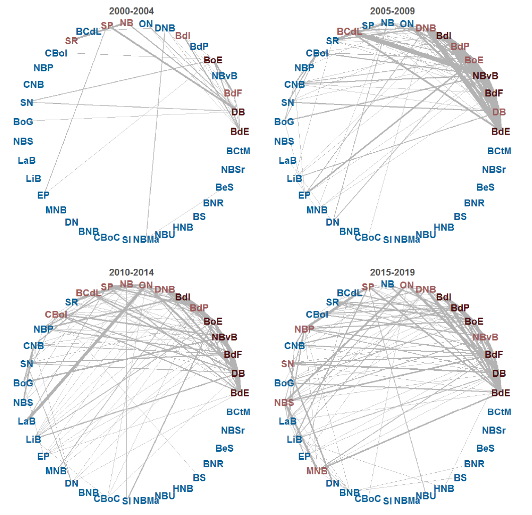 Poznámka ke grafu: Každá hrana mezi dvěma centrálními bankami (uzly) představuje vztah mezi centrální bankou, kde byl článek publikovaný a afiliací autorů. Šířka hrany odráží celkový počet takovýchto vztahů a reflektuje tak intenzitu spolupráce spíše než počet článků. Vztah na počet článků naznačuje zbarvení uzlů. Centrální banky zobrazené červeně publikovaly 80 % všech článků (tmavě červená pro 50 % a světle červená pro dalších 30 %).