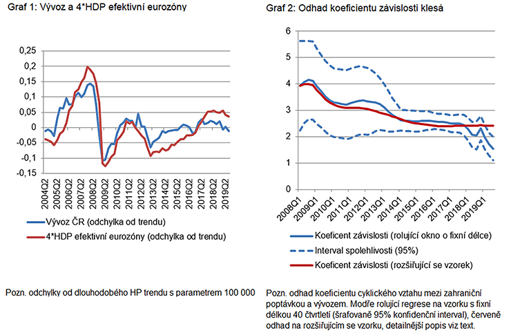 Jak ukazuje Graf 1, vztah mezi čtyřnásobkem dynamiky efektivního HDP eurozóny a vývozem poměrně dobře platil v letech cca 2004–2011. Přinejmenším od roku 2012 však dochází k rozvolnění tohoto vztahu, kdy se nejprve dynamika vývozu držela nad trajektorií implikující jeho výrazný pokles, a následně od roku 2017 růst vývozu naopak nedosahuje růstových temp konzistentních s používaným vztahem. Zřejmě tedy došlo ke snížení koeficientu závislosti.