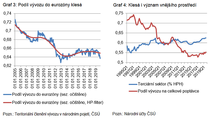 Zároveň roste relativní význam domácí poptávky po české produkci na úkor vývozu. Snižuje se tak závislost růstu českého HDP na vývoji v zahraničí. Graf 4 ukazuje, že podíl vývozu na agregátní poptávce poslední dvě dekády trendově klesá. Zranitelnost domácí ekonomiky vzhledem k vývoji v zahraničí se tedy pozvolna mírně snižuje. Trendově naopak roste podíl terciárního sektoru (tedy obchodu a služeb) na hrubé přidané hodnotě. Terciární sektor je závislý zejména na domácí poptávce, která vlivem silného růstu mezd, situace na trhu práce i stavu veřejných financí není přímo ohrožena.