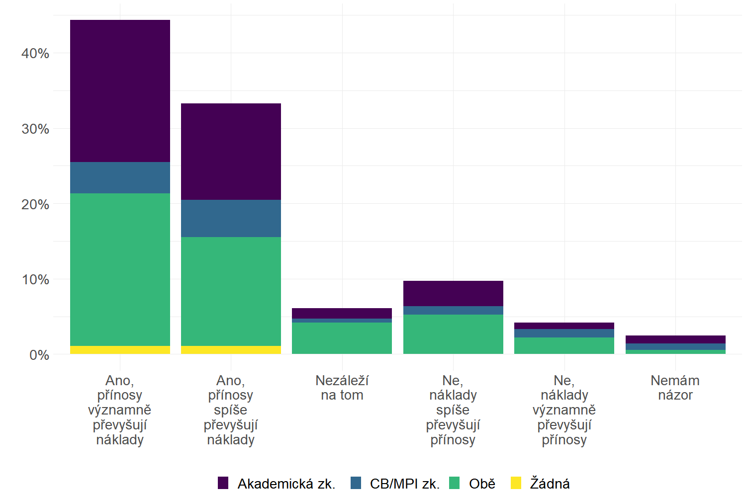 Odborníci z řad akademiků, centrálních bankéřů a pracovníků dohledu a finanční regulace, kteří odpovídali v našem dotazníkovém šetření, mají na institucionální uspořádání makroobezřetnostní a měnové politiky jasný názor. Valná většina z nich spatřuje významné výhody v tom, když jsou obě politiky prováděny centrální bankou (Graf 1a). Téměř 45 % respondentů uvádí, že přínosy z integrace politik „pod jednou střechou“ významně převyšují případné náklady. Dalších 33 % uvádí, že přínosy spíše převyšují náklady. Pouze přibližně 14 % očekává, že případné náklady mohou převážit nad přínosy z této integrace, ať již významně (4 %) nebo spíše (10 %).
