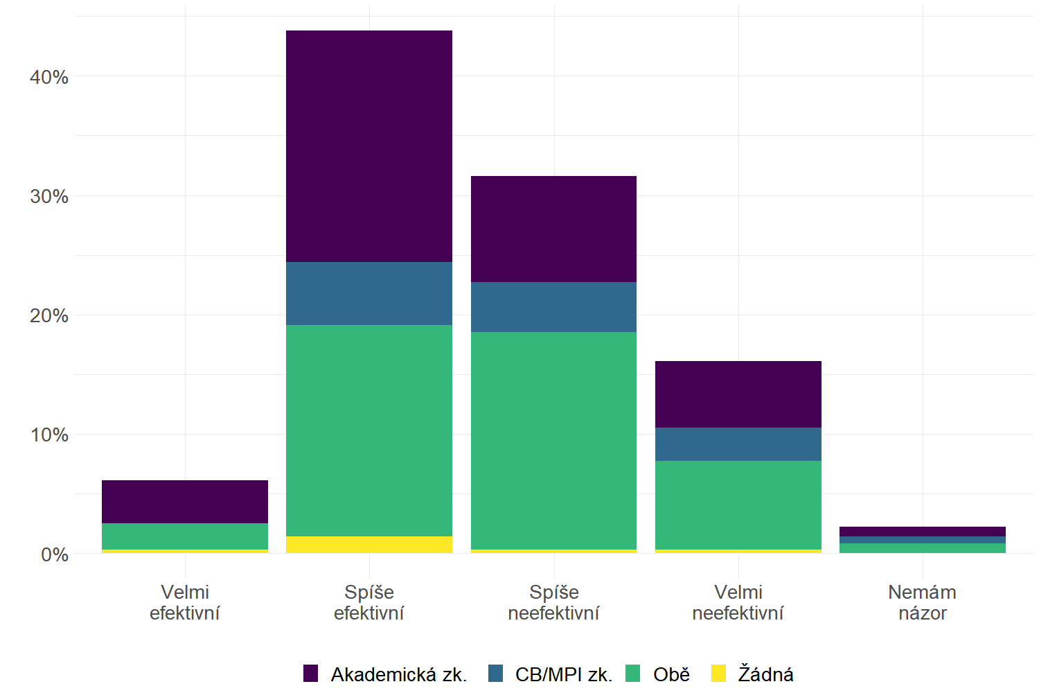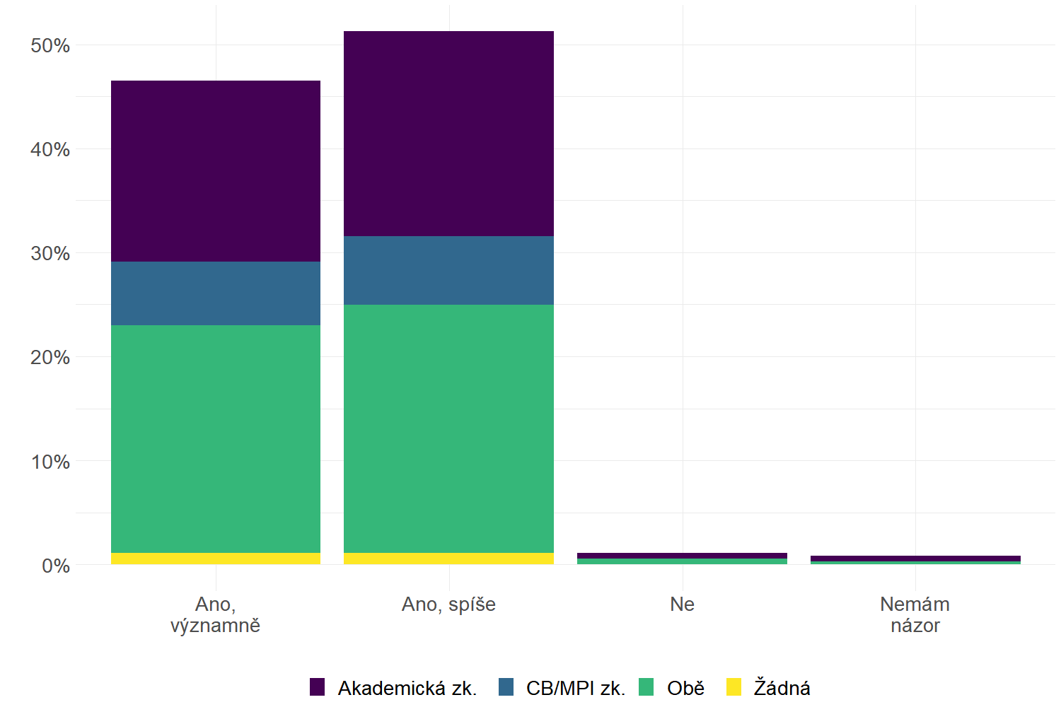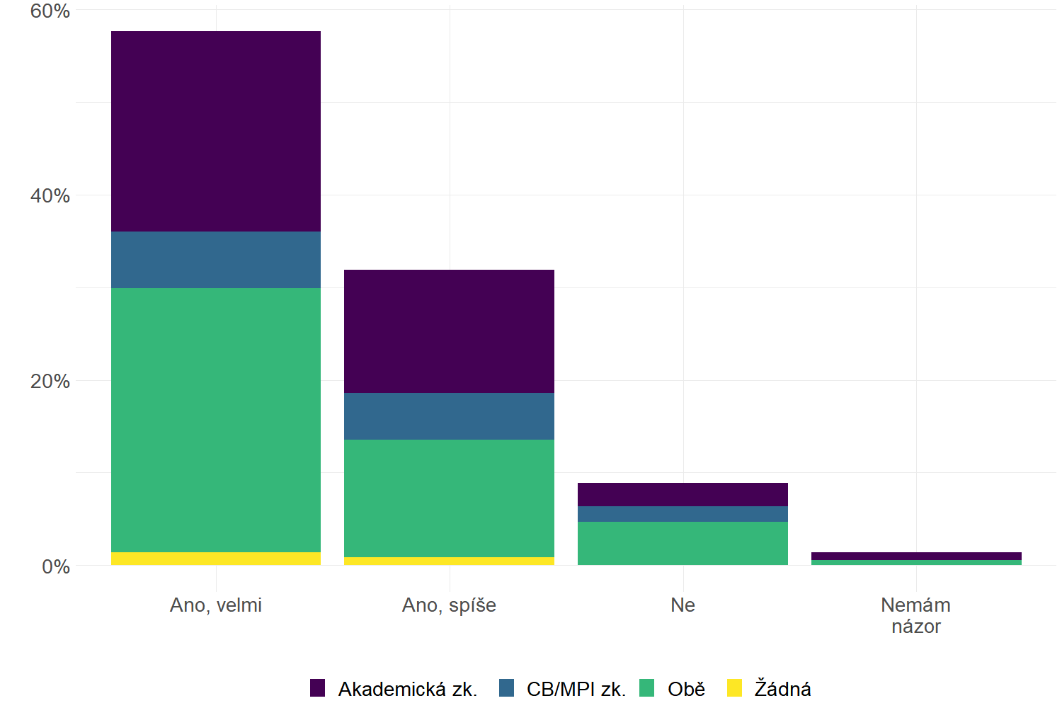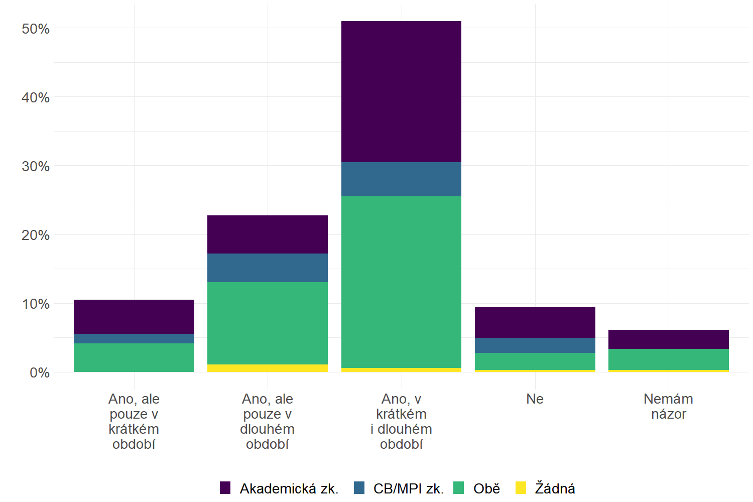 Poznámka: Akademická zk. – respondenti s profesní zkušeností získané v akademii; CB/MPI zk. – respondenti s profesní zkušeností získané v centrální bance a/nebo makroobezřetnostní instituci; obě – respondenti s profesní zkušeností získané v obou oblastech; žádná – respondenti s profesní zkušeností získané mimo akademii, academia, centrální banku nebo makroobezřetnostní instituci.