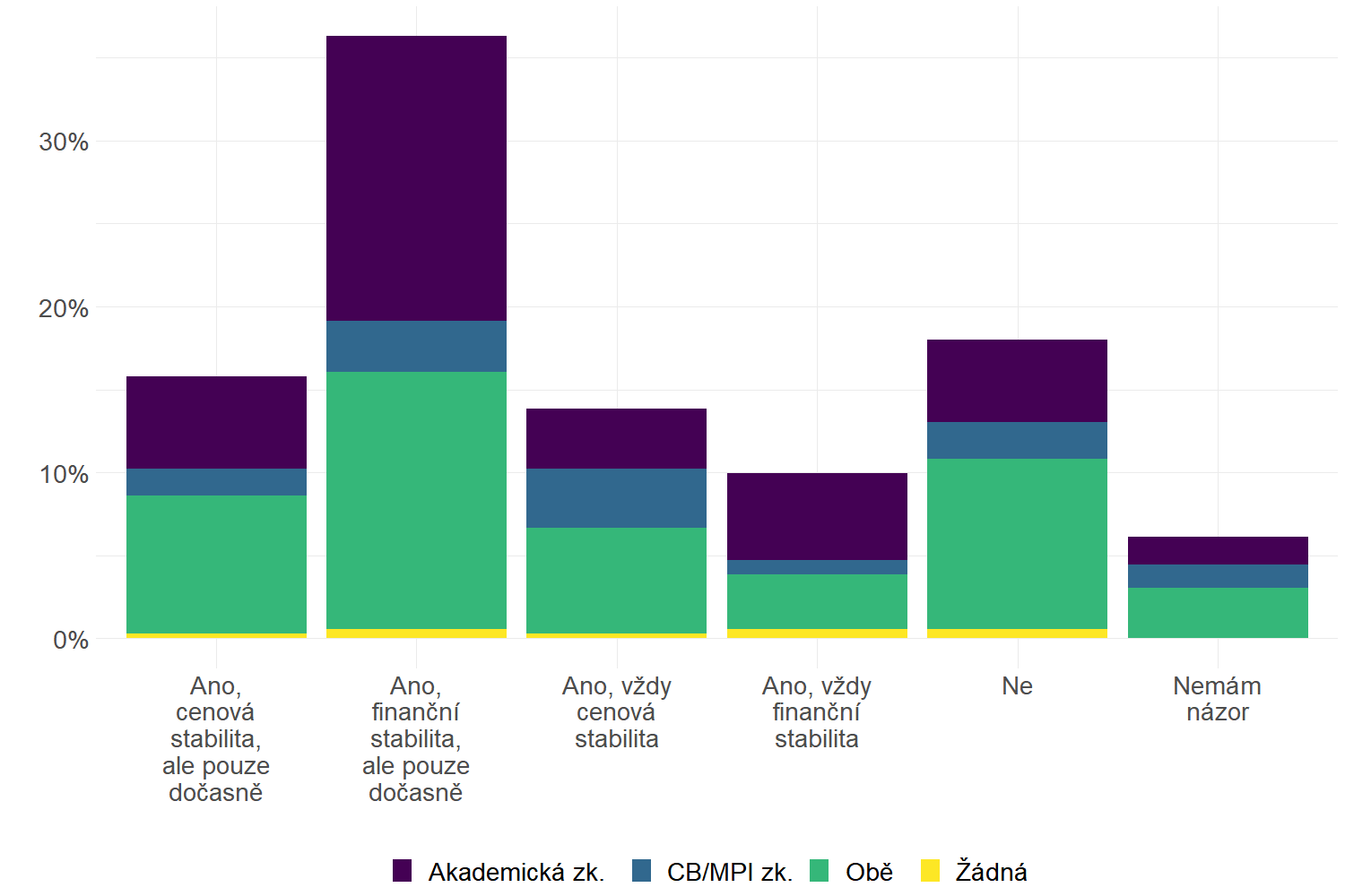 Takřka 50 % všech respondentů v našem průzkumu se přiklání k podobnému názoru: více než 36 % uvádí, že v případě konfliktu mezi dosažením cílů finanční a cenové stability by měl být dočasně upřednostněn cíl finanční stability; dalších 10 % se poté přiklání k tomu, že cíl finanční stability by měl být upřednostňován vždy. Naopak asi 30 % by dalo přednost dosažení cíle cenové stability, ať již dočasně (16 %) nebo vždy (14 %). Téměř 18 % si myslí, že žádný z cílů by neměl být v případě konfliktu upřednostněn.