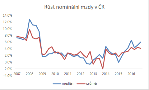 Je evidentní, že mzdová nerovnost v ČR neroste. Průměrná mzda stoupá někdy rychleji než mzda mediánová, někdy pomaleji, ale tento rozdíl nevykazuje jasný trend (přesněji řečeno, průměrná mzda rostla v průměru o 3,5 %, zatímco mediánová o 3,8 %, takže za toto období nerovnost trochu klesala). Zajímavé je, že tempo růstu mediánu překonává průměr zejména během konjuktury, tedy před velkou recesí a v současné době, zatímco mzdová nerovnost se zvyšuje převážně během recesí, tedy v roce 2009 a v letech 2012–2013. Je tomu tak proto, že mzdy a pracovní místa hůře placených zaměstnanců jsou více citlivé na ekonomický cyklus. Dostatečné uvolnění měnové politiky v recesi, ať už snížením úrokových sazeb či dalšími nástroji, tak tlumením intenzity krize pomáhá též snižovat mzdovou nerovnost.