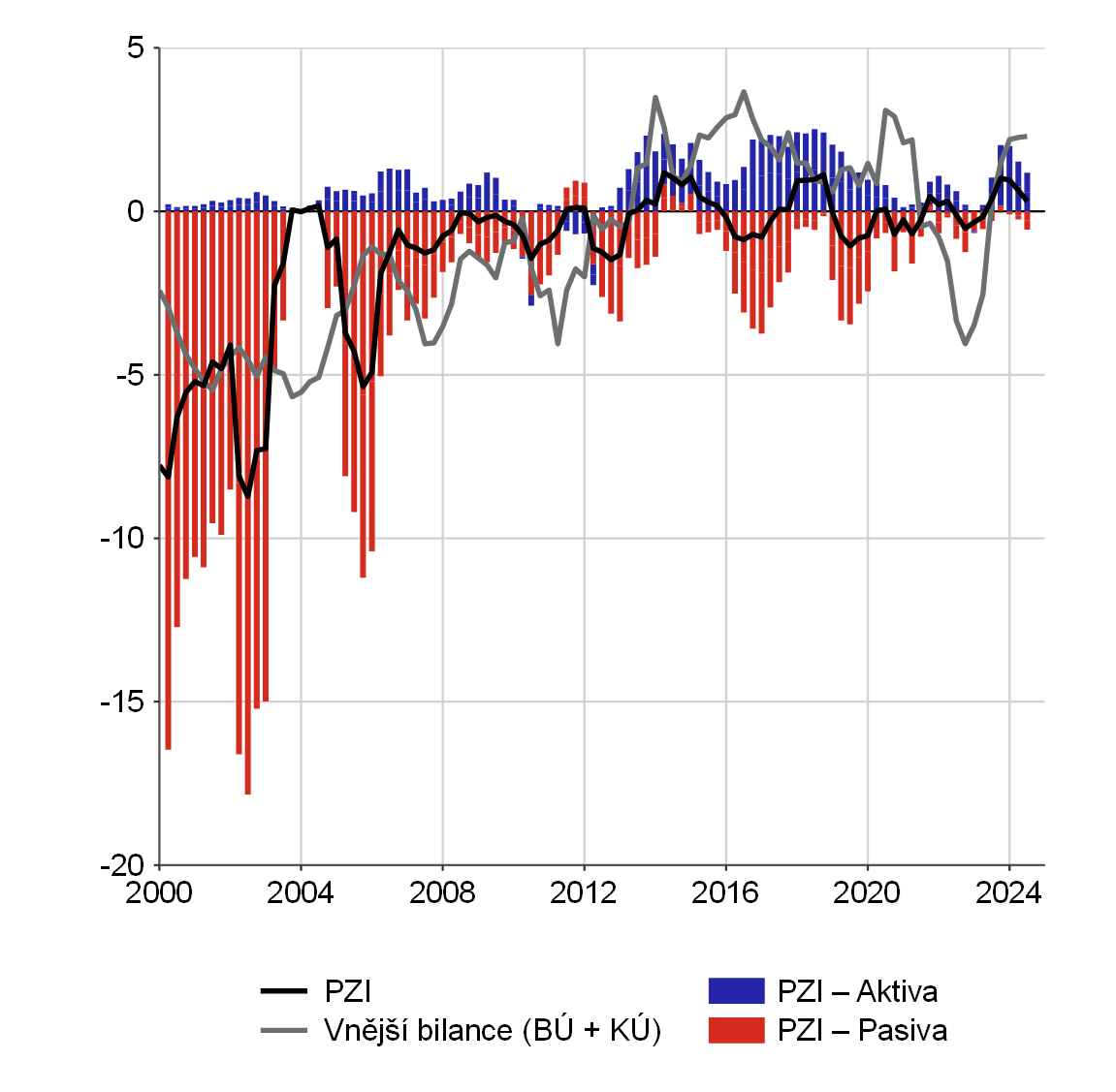 Pozn.: Přímé zahraniční investice (PZI) zahrnují pouze nové účasti (bez reinvestic a dluhového kapitálu). Záporná vnější bilance znamená příliv kapitálu, kladná odliv. BÚ – běžný účet, KÚ – kapitálový účet