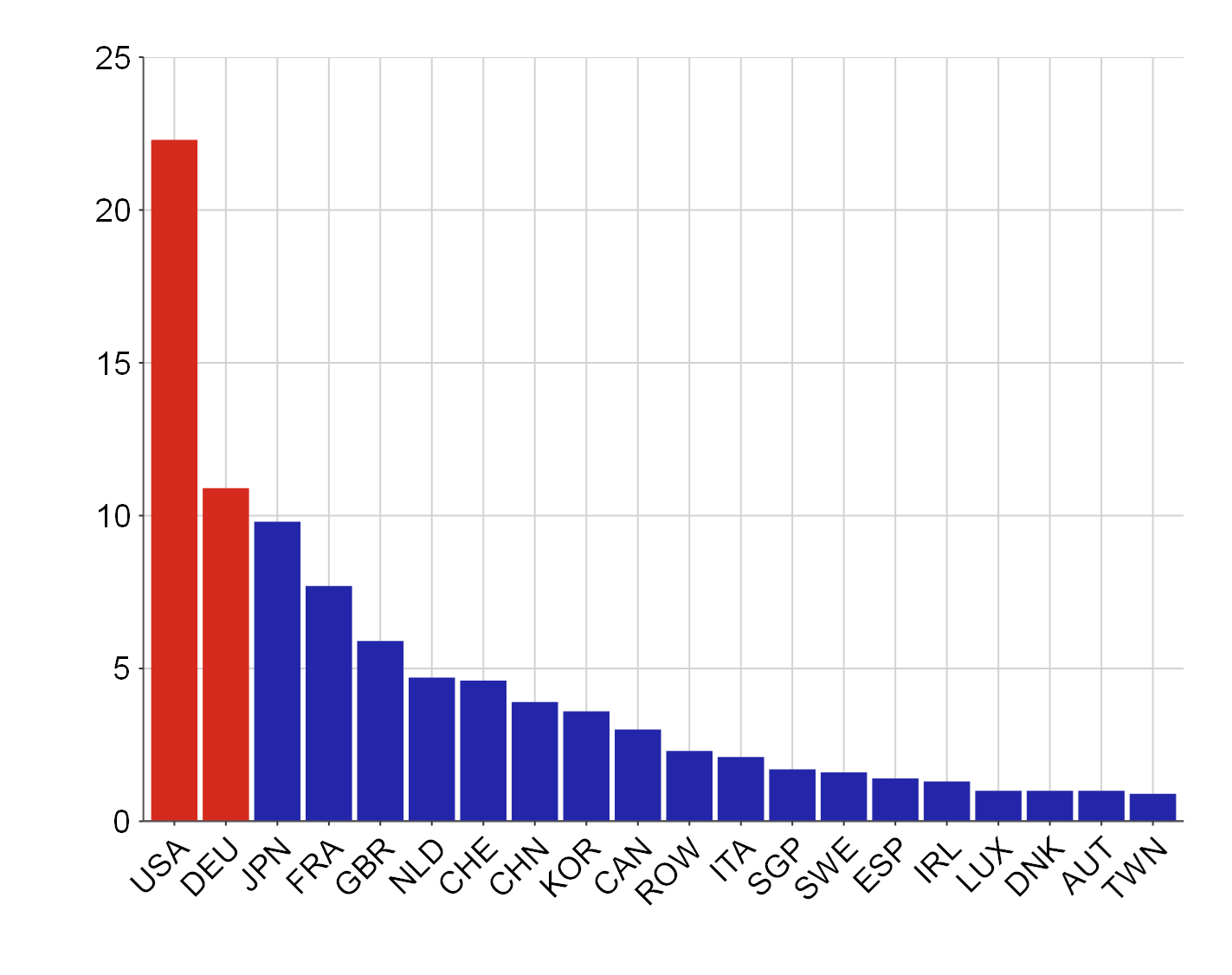 Data naznačují, že Německo přesouvá koncové fáze výrobního řetězce, zatímco USA spíše vyhledává zahraniční dodavatele. V německém národním produktu tedy zahraniční pobočky figurují vyšší vahou oproti Spojeným státům. To může být důsledkem vyššího podílu investic, které do zahraničí míří s cílem obsloužit tamní trh. Přesouvání koncových fází výrobního řetězce z Německa (například přesun výroby některých modelů aut do východní Evropy[12], nebo přesouvání chemických koncernů do Číny), vede k relativně vyššímu produktu zahraničních poboček, neboť se v zahraničí registruje konečná hodnota vyrobeného produktu včetně všech vstupů. Naopak, při přesunu různých částí výrobního řetězce ze Spojených států registruje zahraniční výroba pouze hodnotu vyrobených surovin a vstupů. Tyto meziprodukty se potom exportují zpět do domácí ekonomiky, kde se hotový produkt finalizuje (příkladem může být přesun výroby čipů do Číny nebo na Tchaj-wan, odkud pak čipy putují zpět do USA, kde se teprve stávají součástí hotového výrobku). Jelikož je finální výroba realizována v domácí ekonomice, hodnotu celého finálního produktu si připíše americká společnost. To potvrzují i data, která sledují, co a odkud nadnárodní společnosti dovážejí. V roce 2021 činil podíl tzv. intra-importů (tedy importů v rámci vlastnicky provázaných podniků) amerických společností na jejich celkových dovozech 86 %. Tedy naprostá většina toho, co americké nadnárodní společnosti dovážejí ze zahraničí, pochází z jejich vlastních dceřinných společností umístěných v jiné zemi.[13]