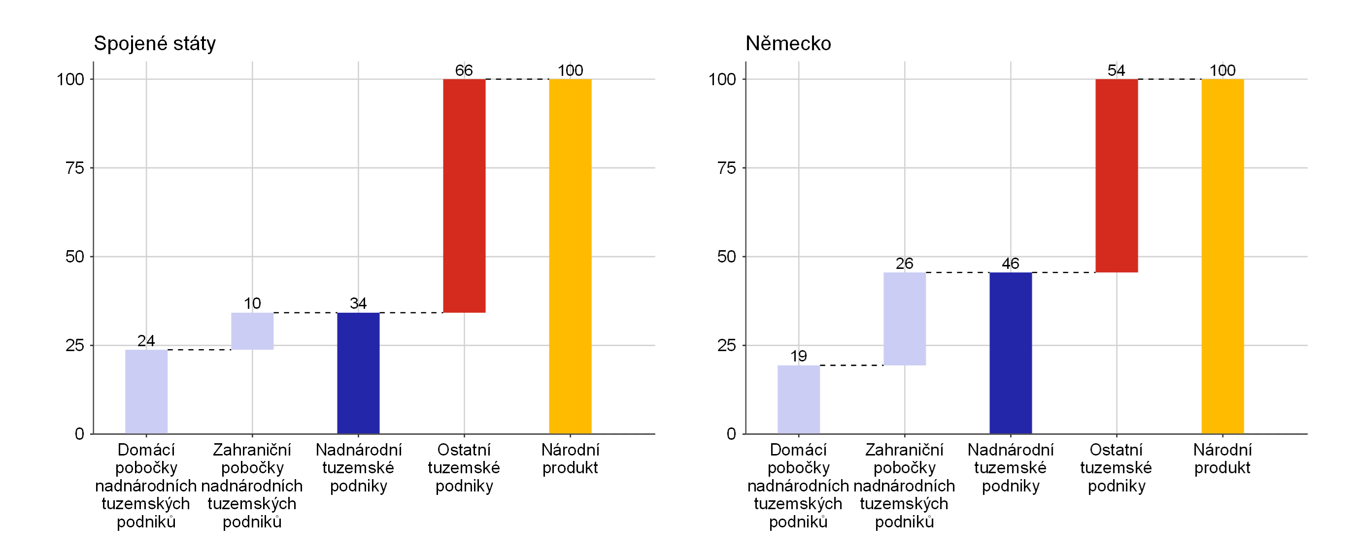 Zahraniční pobočky, které jsou pod kontrolou Spojených států a Německa, dominují světové produkci. Graf 3 znázorňuje podíl jednotlivých států na celkové produkci všech zahraničně vlastněných poboček. Zahraničně vlastněná pobočka je společnost, jejíž vlastník nebo kontrolující mateřská společnosti sídlí v jiné zemi. Na příkladu Německa je Volkswagen AG nadnárodní tuzemský podnik a Škoda Auto je její zahraniční pobočkou (sídlo je v ČR, ale vlastnictví je německé). Jak ukazuje Graf 3, podíl německy vlastněných zahraničních poboček (např. Škoda Auto, Seat, BASF) na celkovém produktu všech zahraničních poboček je lehce přes 10 %. To znamená, že Německo po celém světě vlastní společnosti, které dohromady vyrábějí 10 % celkového produktu všech zahraničních poboček s různými vlastníky. Před Německo se na první místo staví Spojené státy, jejichž zahraniční pobočky vyrábějí téměř čtvrtinu celkového produktu všech zahraničních společností.