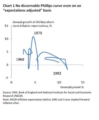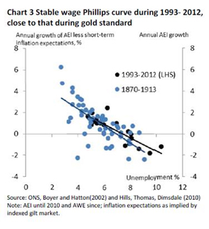 Nyní se ale podívejme na „Chart 3“ mapující vztah mezi neočekávanou inflací a nezaměstnaností v období zlatého standardu před 1. světovou válkou a mezi lety 1993 až 2012 (tedy v době, kdy Bank of England přešla na systém inflačního cílování). Stabilita vztahu mezi neočekávanou inflací a nezaměstnaností jakož i obdobný sklon obou křivek jsou až šokující. Doktrína inflačního cílování nejspíš mnohem lépe vytváří podmínky, ve kterých jsou klíčoví ekonomičtí agenti a instituce zprostředkovávající transmisi měnové politiky do reálné ekonomiky schopni chápat pravidla, jimiž se měnová politika řídí. A tím jsou vytvořeny předpoklady pro to, aby centrální banka skutečně mohla anticyklickou politikou ekonomiku stabilizovat. Navíc se zdá, že kvalitativní pevnost tohoto vztahu takřka odpovídá době zlatého standardu, kdy se centrální banky v anticyklické politice v takové míře zdaleka neangažovaly. Což sice mělo vcelku blahodárný vliv na ceny, ale v moderních demokraciích už asi nepřijatelné procyklické dopady na reálnou ekonomiku.