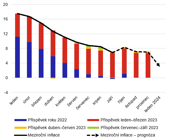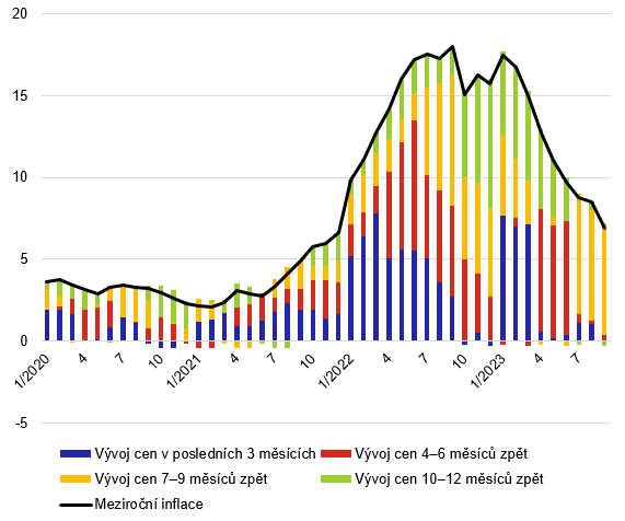Graf 3 – Rozklad meziroční inflace v roce 2023 na cenový růst v jednotlivých obdobích