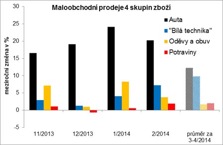 2 Výkyv v nákupech potravin na Velikonoce (loni k nim došlo v březnu, letos v dubnu, což se v daných měsících projevuje prudkým propadem meziročního údaje o nákupech potravin v březnu a nárůstem v dubnu) jsem pro jednoduchost vyřešil tím, že za březen a duben jsou v grafu průměry růstu prodejů za jednotlivé kategorie zboží.