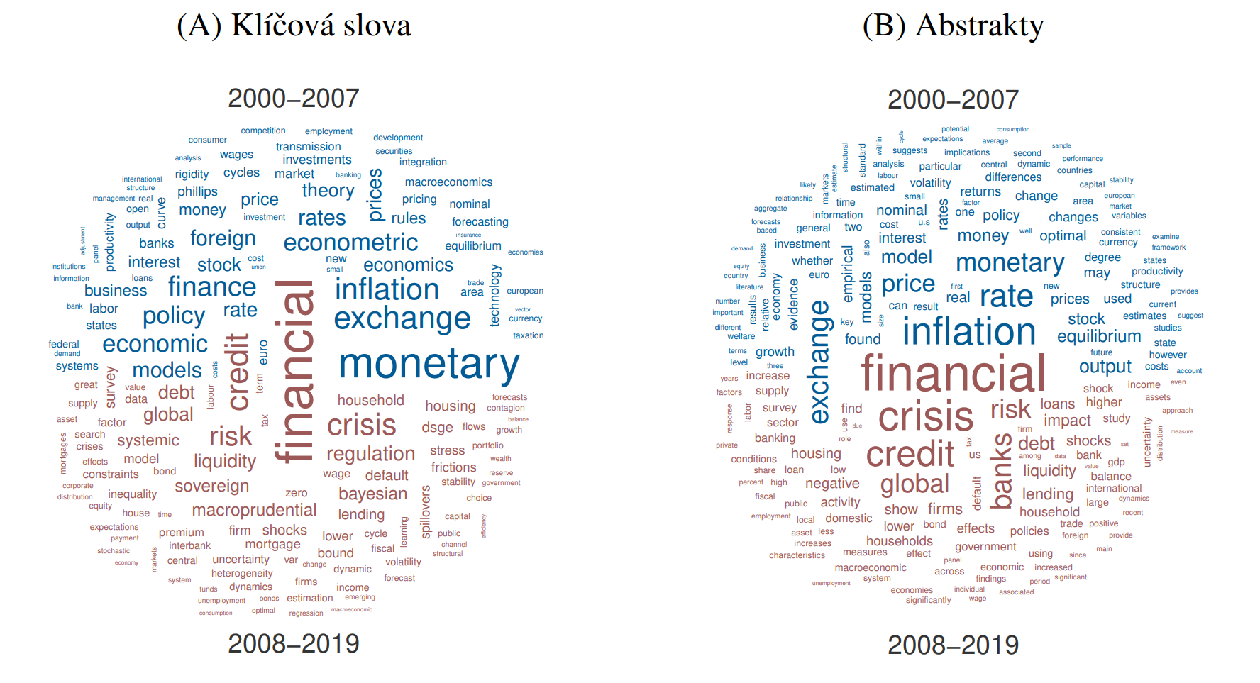 Širší výzkumné oblasti, které zachycují tzv. JEL kódy (metoda klasifikace odborné ekonomické literatury), se v čase mění pouze minimálně. Více než polovina všech výzkumných článků svým zaměřením spadá do dvou oblastí – makroekonomie a měnová ekonomie (E) a finanční ekonomie (G). To není překvapením, protože to odráží dva hlavní cíle, které centrální banky obvykle sledují – cenovou stabilitu a finanční stabilitu. Pokud se však na vývoj témat podíváme optikou klíčových slov a slov objevujících se v abstraktech článků, vidíme v grafu 1 poměrně razantní zlom po světové finanční krizi 2008-2009. Zatímco před rokem 2008 byla pozornost výzkumu věnována především měnové politice a makroekonomickým tématům (modrá část grafu), po roce 2008 se výzkum zaměřil na otázky finanční stability – chování finančního sektoru, systémové riziko, krize, dynamika úvěrů či obezřetnostní regulace (červená část grafu).
